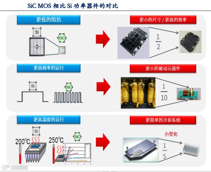 SIC 的功率器件如 SIC MOS,相比于 Si 基的 IGBT,其导通电阻可以做的更低,体现在产品上面,就是尺寸降低,从而缩小
