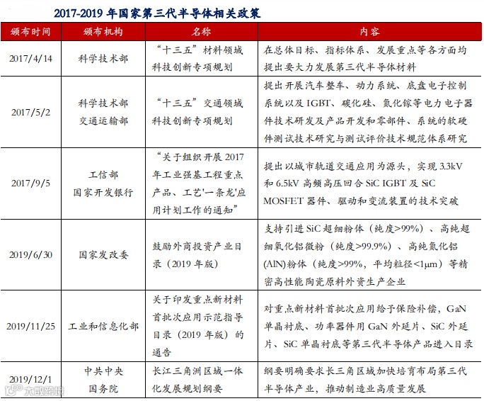 我国的“中国制造2025”计划中明确提出要大力发展第三代半导体产业。2015年5月,中国建立第三代半导体材料及应用联合创新基地,抢占第三代半导体战略新高地;国家科技部、工信部、