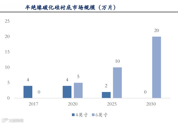 2025-2030年市场需求:4英寸半绝缘衬底逐渐退出市场,而6英寸需求到20万片。