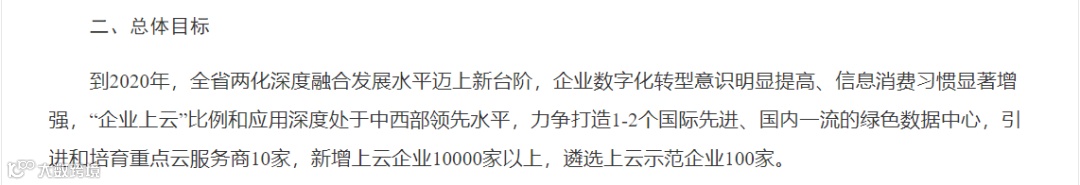 到2020年,新增上云企业1万家,遴选上云示范企业100家,力争打造1-2个国际先进、国内一流的绿色数据中心,引进和培育重点云服务商10家,“企业上云”比例和应用深度处于中西部领先水平。