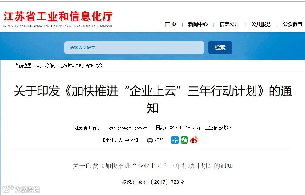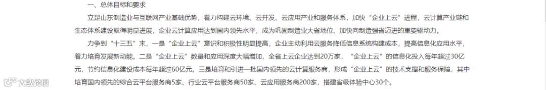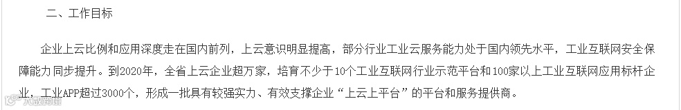 到2020年,推动全省3万家工业企业上云,带动10万家中小企业上云,节约信息化建设成本每年超过30亿元;引进和培育一批国内领先的云平台服务商,打造综合性云平台服务商2-3家、行业云平台服务商20家、上云标杆企业100家,构建企业云服务生态体系。