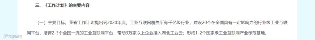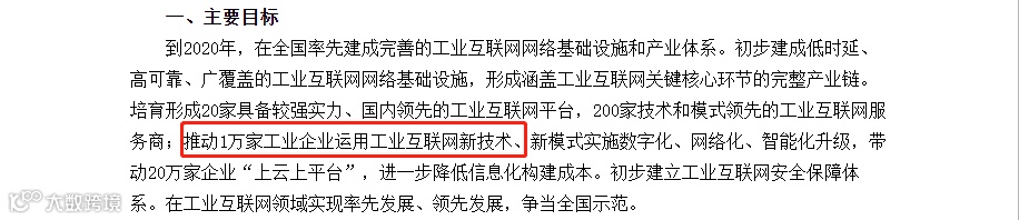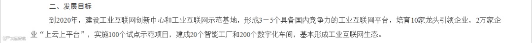 到2020年,支持1万家企业“上云上平台”,培育200家技术、产品和模式领先的工业互联网供应商,形成20家具备较强实力、国内领先的工业互联网平台。