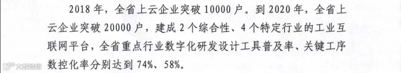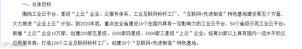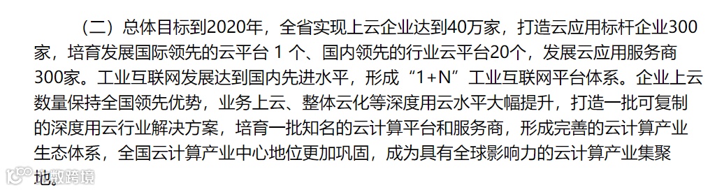 到2020年,新增“上云”企业2万家外,培育“上云”标杆企业100家;引进和培育一批国内领先的云平台服务商,培育云应用服务商50家,建设 2-3个跨行业跨领域的工业互联网平台及10-15个行业云平台,打造企业上云体验中心10个。