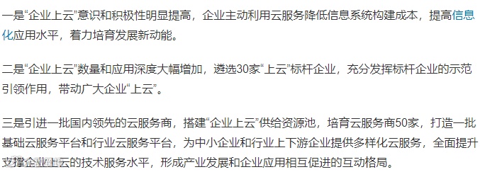 到2020年,上云企业达到20万家,培育国内领先的综合云平台服务商5家、行业云平台服务商50家、云应用服务商200家,搭建省级体验中心30个。