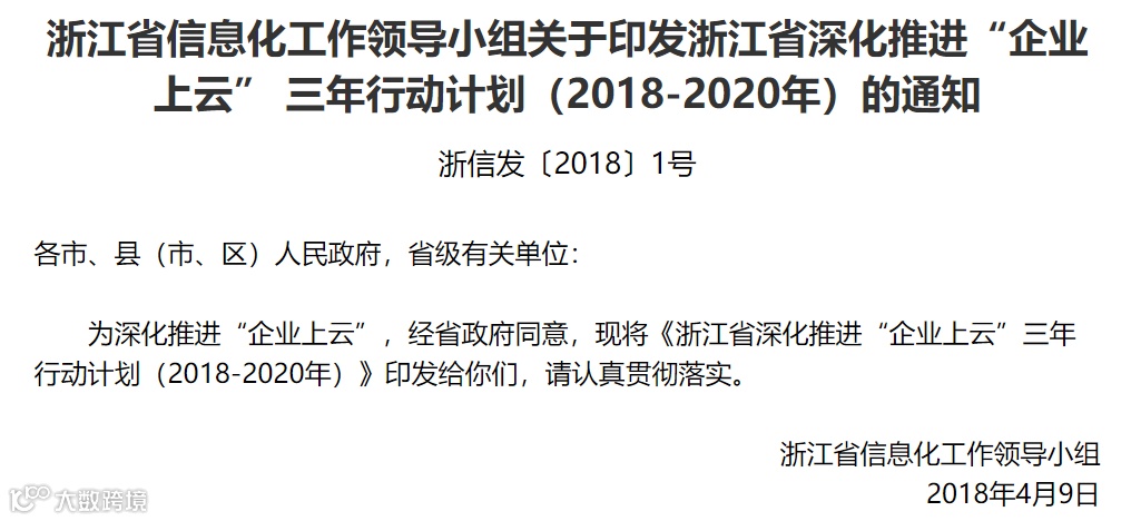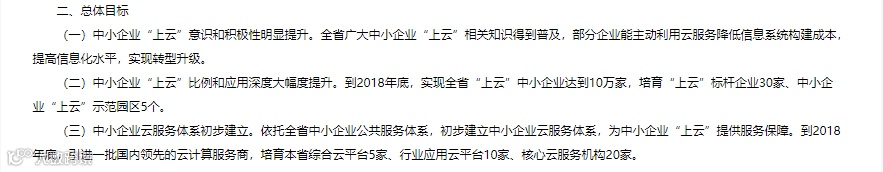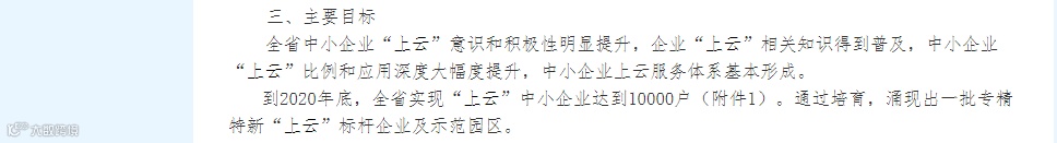 到2018年底,实现全省“上云”中小企业达到10万家,培育“上云”标杆企业30家、中小企业“上云”示范园区5个、综合云平台5家、行业应用云平台10家、核心云服务机构20家。