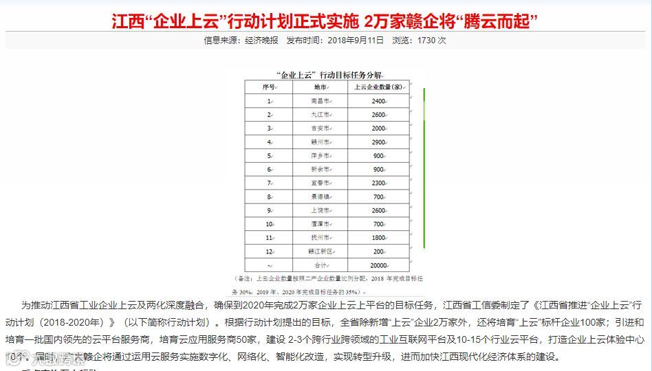 到2020年,遴选30家“上云”标杆企业,引进一批国内领先的云服务商,搭建“企业上云”供给资源池,培育云服务商50家。