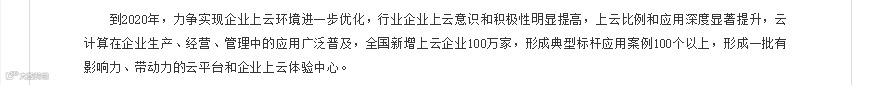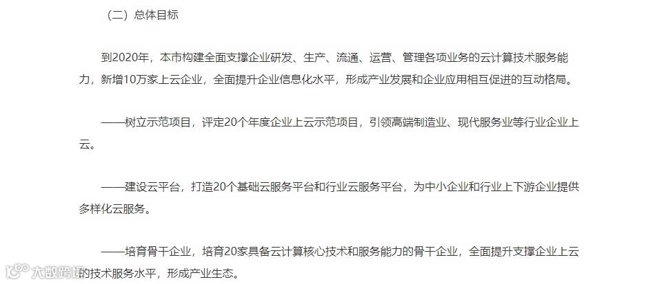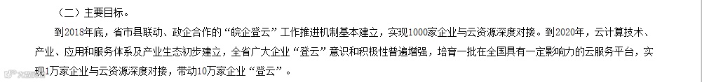 到2020年,实现10万家企业“上云上平台”,树立20个年度企业上云示范项目,打造20个基础云服务平台和行业云服务平台,培育20家具备云计算核心技术和服务能力的骨干企业。