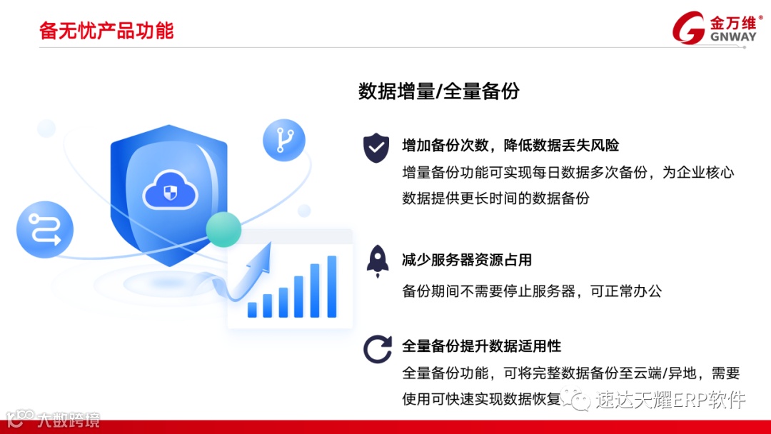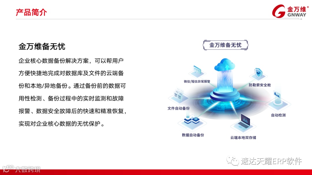 金万维备无忧,原名金万维云备份,是一款可以自动备份数据库的数据备份产品,更是一款简单易用且高性价比的灾备服务软件,可以为私有化云端部署以及自建机房内的文件,SQL Server、MYSQL数据库等提供安全,高效的备份和容灾保护。