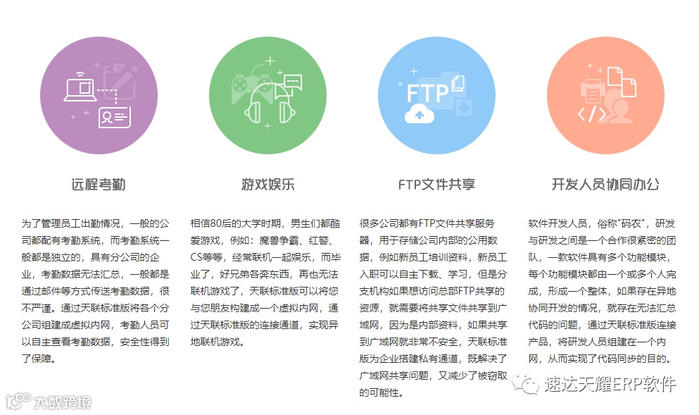 OA、CRM一般为B/S架构基于网页形式访问的系统,在广域网应用中数据传输安全是企业顾虑的问题,天联标准版为企业搭建私有专线,不暴露在公网,从而达到了安全传输的目的,被广泛应用于致远、泛微等大型OA系统。