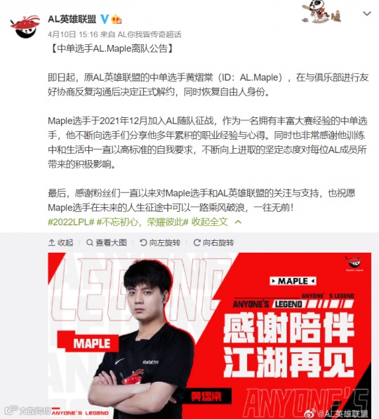 值得一提的是,就在Doinb直播间“泄露天机”的半个小时之内,AL战队就正式发布了,与中单选手Maple解约的公告,让他恢复了自由人身份。换言之,有关“那个人”会去北美赛区打职业的消息,几乎已经可以被实锤为真消息。