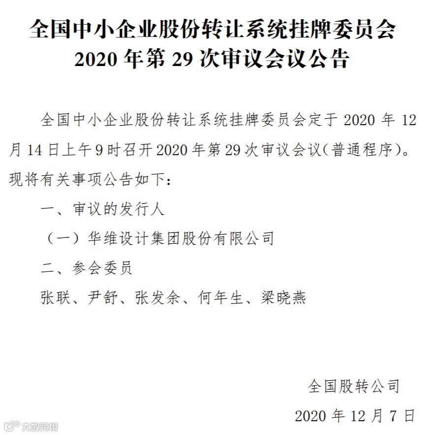 股转公司网站显示,挂牌委员会定于12月14日召开2020年第29次审议会议,审议华维设计的精选层挂牌申请。