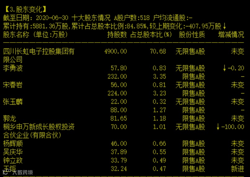 长虹能源的控股股东与上市公司四川长虹一样,均为四川长虹电子控股集团有限公司,实际控制人则都是绵阳市国资委。其2020年半年报显示,第一大股东四川长虹电子控股集团有限公司持有其4900万股,占总股本比例为70.68%。
