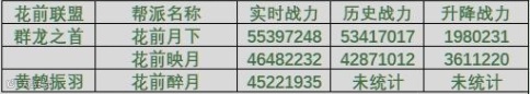 花前联盟属于最近刚刚崭露头角的一个新兴联盟,虽然联盟名下的帮派不多,但个个都是精英,主帮花前月下的总战力甚至要超过问鼎天阙的5400W,达到了惊人的5500W。