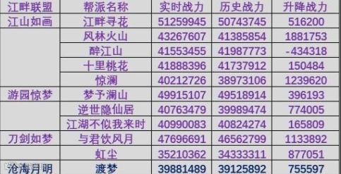 最后再来看看江畔联盟了,这也是一个屹立不倒的老牌联盟,目前共有12个帮派,主帮战力达到5100W。