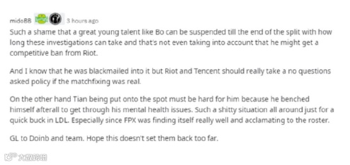 必须要提到的一点是,一年前当Bo最初被曝出曾被裹挟参与假赛时,外网的评价几乎是一水儿的“必须严惩。”可当Bo这个职业赛场上打出过优秀表现的选手,有加入NA赛区的可能时,他们的口风就变了。