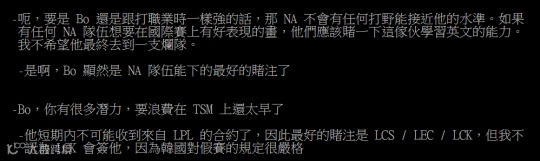 搬运自Reddit论坛的北美网友回复,则一改之前“大义凌然”的措辞。当地观众非常期待Bo能够加入NA赛区,因为他们认为“NA不会有任何打野能接近他的水准。”