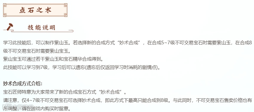 点石之术就更值得说说了,这个技能给了你100合成出8级宝石的可能,改变了从几率成功到100%成功的模式,但是需要你付出应有的代价,首先把技能升到顶级再说吧;