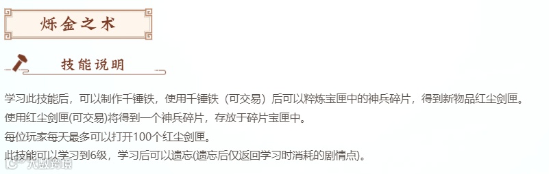 其中烁金之术改善了神兵碎片只能自己积累到50个才能换的局面,估计会有很多人来挑战换神兵;灵巧之术也解决了装备只能在拆除套装后才能继续炼化、武器只能取消炼器才能继续炼化的情况,这个功能可能不会被广泛使用,毕竟很多玩家都是在炼化完成后才进行武器开光;装备选择好后才进行打造套装。其目的在于给了玩家多了一种选择,如果你后悔了炼化或者打造的套装,你不用再“毁掉”它了。