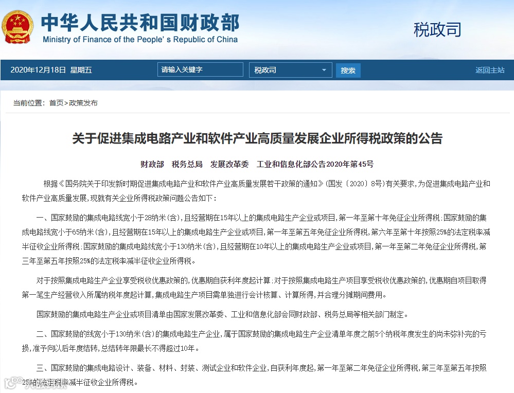 12月17日,财政部、国家税务总局、国家发展改革委、工业和信息化部四部委联合发布了《关于促进集成电路产业和软件产业高质量发展企业所得税政策》的公告,明确了集成电路产业和软件产业企业所得税政策。
