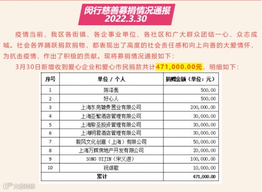 那么LPL的选手又在忙些什么呢?答案是献爱心。昨日上海闵行区通报2022年3月30日慈善募捐情况,其中LPL选手宋义进(游戏ID:Rookie)定向捐款10万元;战队经理祝颂歌(苏小落)捐款1万元。