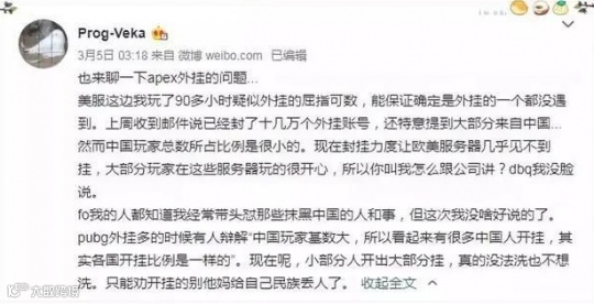 而关于“大部分开挂者都是中国玩家”这个论断,一个在重生工作室任职的中国员工,也通过在微博发帖肯定了这件事的真实性。如此一来就彻底坐实了一小部分中国玩家,开了大部分外挂。