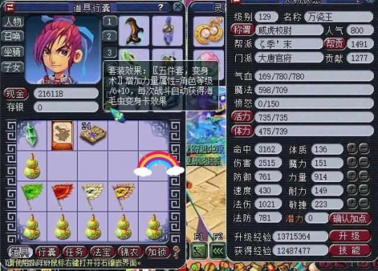 【大雁塔】一位129级大唐晒出远古0级无级别腰带和属性图。表示780气血在调息技能和再生头的作用下,能做到不吃包子无限用横扫,5件海毛虫套加快出手速度,基本是骷髅大唐的极致。
