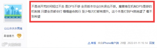 总结下来,最大的问题还是在输出上,如果输出不到位,就算熟悉机制也没有用,基本上大部分玩家现在都卡在P3,P4阶段还没有见到。如此之高的难度,也让大家开始质疑:“硬核”的定义,难道就是数值碾压?