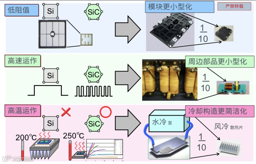 1、极小的通态电阻,进而缩小芯片的面积,SiC功率模块的尺寸可达到Si的1/10左右。