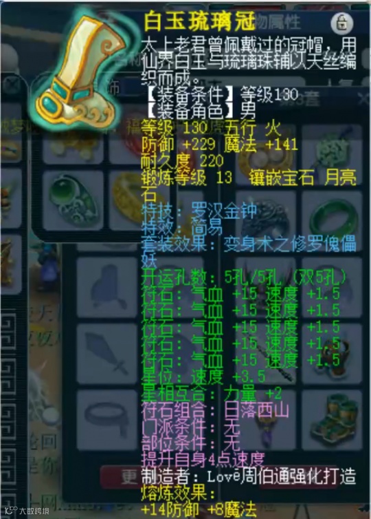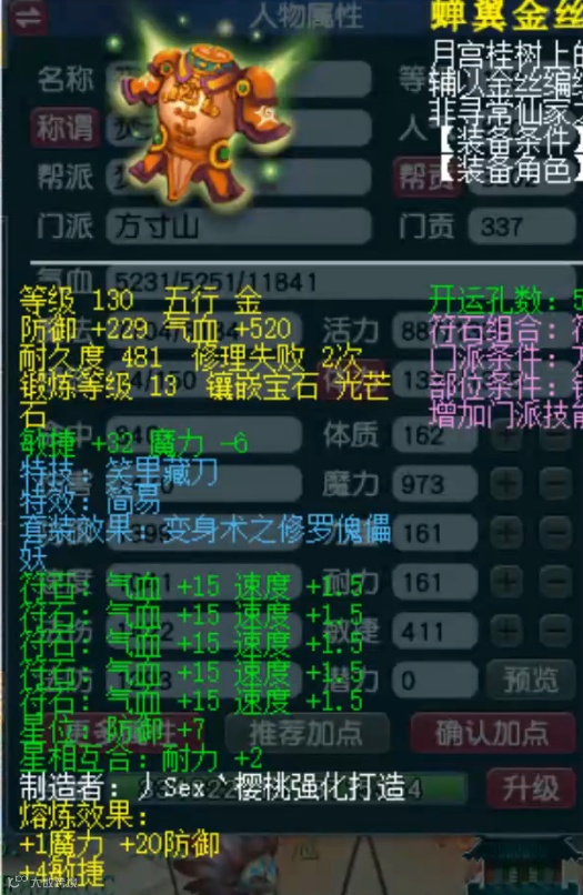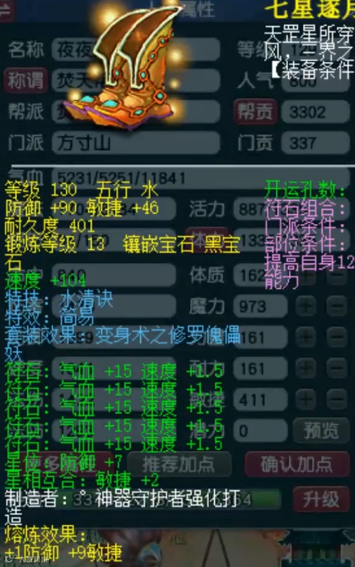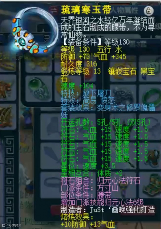 13锻双蓝字130级男衣,气血520,防御249,敏捷+36