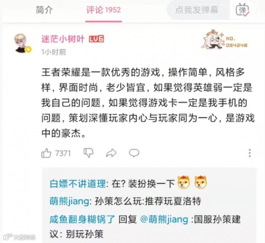 被称为“孙策天花板”的主播树叶也在B站视频的评论区,发表了自己的看法。而里面除了一些恭维的话,剩下的就都是对王者荣耀策划的吹捧,但看在孙策出新皮肤的份上,大家也都心照不宣了。