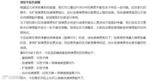 最后来说一下关于弹匣和AUG的改动。现在快速弹匣的换弹速度提高60%,扩容弹匣子弹则会增加42发,加长快速弹匣变为40发子弹+15%换弹速度。这个改动对于所有枪都是生效的,但是为什么要配合AUG一起说呢?此次更新当中AUG的伤害提高了1,有效射程也得到了加强。配合改版之后的新弹匣,在P90削弱的情况下,AUG有望凭借其强大的综合性能,重新回到T1级别的步枪选择行列当中。