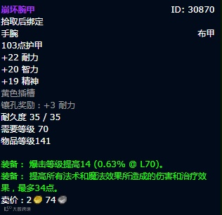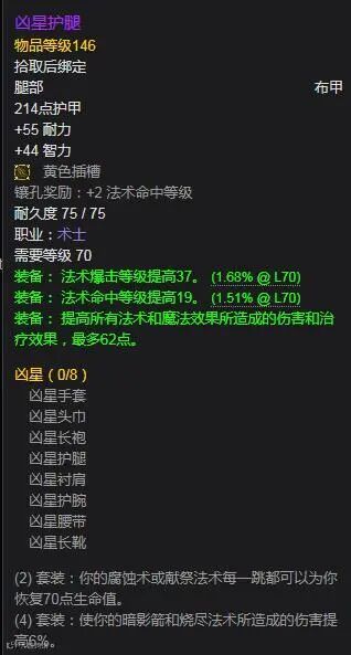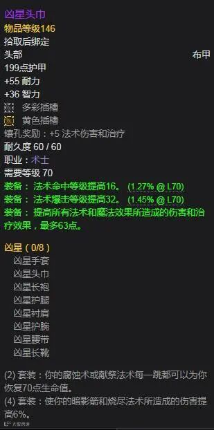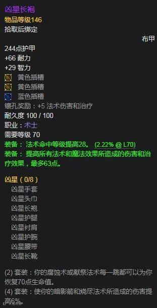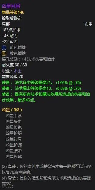 肩部装备首选T6护肩。加命中和爆击非常适合术士,还有双插槽也让这件装备更容易配装。
