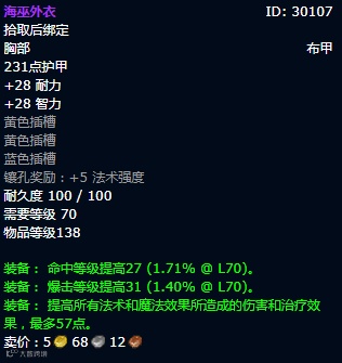 胸部装备有海巫外衣和T6,但两者属性对比后,海巫更胜一筹!还没拥有的玩家赶紧入手了!毕竟T5团以后开的可能会相对较少,这件装备可能会涨价。