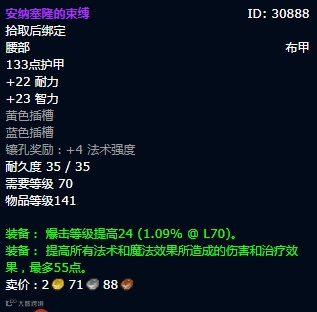 腰部装备首选安纳塞隆的束缚,高爆击等级和高法强,两个插槽让这件装备属性变得非常强力。