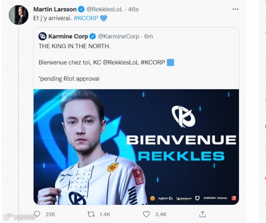关于双方达成交易的具体时间,暂时无从得知,但可以确定的一点是,KC战队早在S11英雄联盟全球总决赛开始前,就已经接触起Rekkles了。当时LEC女主持Bulii曾立下Flag:“如果Rekkles能从G2出来,然后你把他搞到KC的话,我就和Karnage和Trayton(法国战队OTP的创始人和选手)一起在香榭丽舍大街裸奔!”