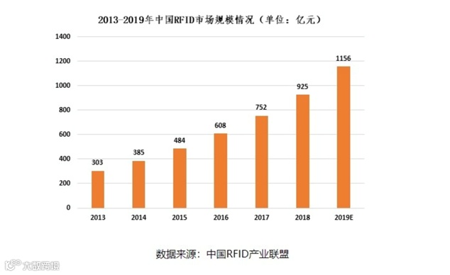 自2006年科技部等15部委发布《中国射频识别(RFID)技术政策白皮书》,中国RFID及物联网产业得到了长足的发展。2011至2018年,中国RFID行业的市场规模保持上涨趋势,且增速保持较快。其中,2013至2018年年复合增长率达25%。2018年中国RFID行业市场规模为925亿元。预计2019年我国RFID行业市场规模将达到1156亿。