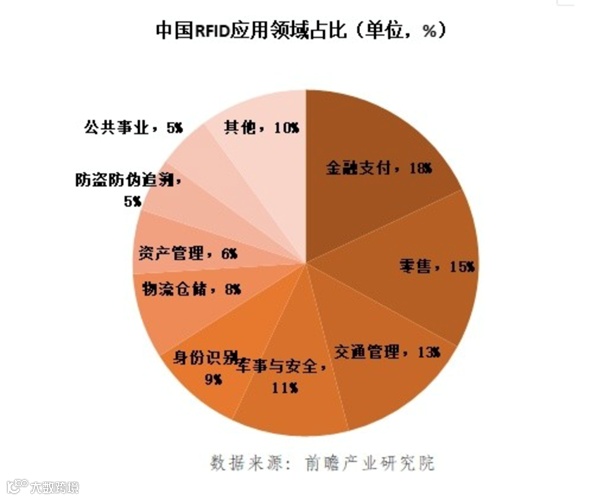 在中国,RFID最开始主要用于物流,资产管理和防盗防伪,之后应用范围不断扩大至安全、医疗、交通运输、食品安全等多个领域。随着中国经济的高速发展,RFID在金融支付、物流、零售、制造业、服装业、医疗、身份识别、防伪、资产管理、交通、食品、动物识别、图书馆、汽车、航空、军事等其他领域都将发挥越来越关键的作用。