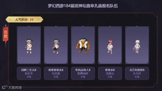 在上届武神坛中,银河、阿七的组合终于为曲阜孔庙拿下了开区的第一冠,圆了奋斗多年的老板梦想同时也吸纳了不少新鲜血液。虽说上联的武神坛冠军中有战神加持的成分,但曲阜孔庙也有过不带战神杀入决赛的佳绩,所以其硬件实力、软件实力均属上乘,再加上区内联赛帮派的鼎力支持,相信他们依然具备突破自我的实力。