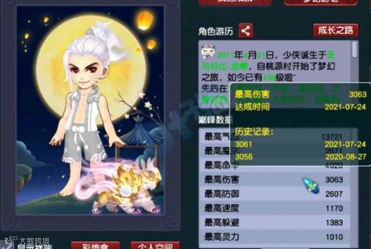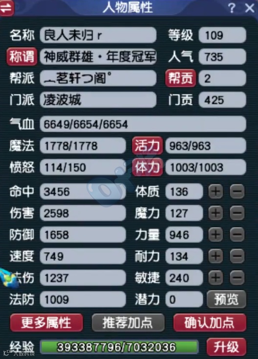 老板的全力加点无符属性图,角色拥有6654气血、2598伤害、1658防御、749速度、1009法防,伤害极高,一些普通天科玩家甚至表示自愧不如。