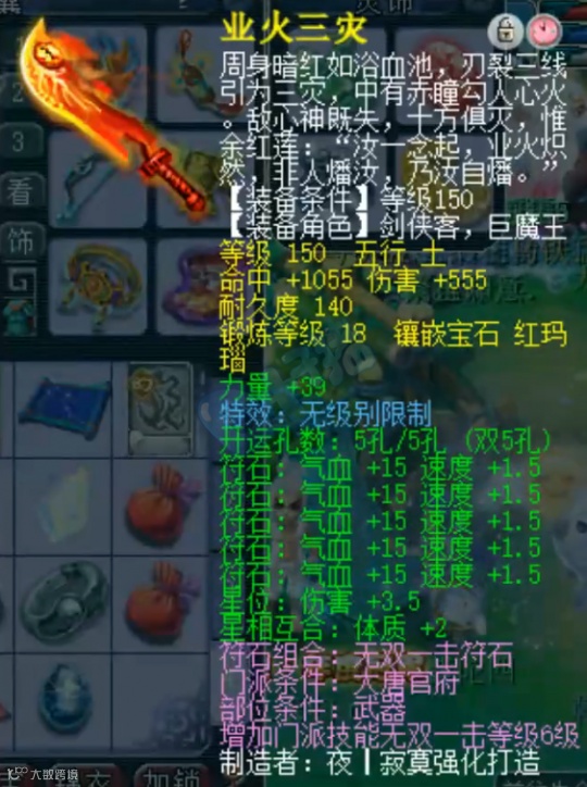 18锻150级无级别刀,1055命中,555伤害,单加39力量,人族用932+总伤,可以说老板玩全部的物理门派都是顶尖水平。