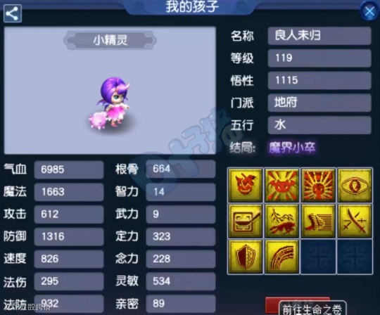 魔劲激发地府孩子,综合属性664+323+228+534=1749,非常顶尖的属性,速度配得刚刚好。