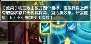 物理攻击敌方四个目标,驱散其身上所有增益状态并无视其保命、复活类效果;击倒目标后自身进入“灭魂”状态,回合数等于击倒目标数;所需能量:8(不可叠加使用次数)。