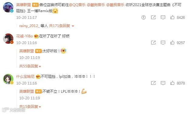 总体来讲,这次合作还是得到了许多玩家的支持!特别是听过主题曲后都赞不绝口!风评几乎是一边倒,“太燃了,好听”!小编也第一时间去听了,确实是激昂澎湃!当总决赛现场响起这首主题曲时,相信每个选手的内心都会被点燃起来!最后还是要说一句:LPL加油!