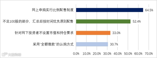 对于新三板精选层的新股申购规则,64.5%受调查投资者认为亮点在于“网上申购实行比例配售制度,根据网上发行数量和有效申购总量的比例计算各投资者获配数量”;52.4%受调查投资者认为亮点在于“不足100股的部分,汇总后按时间优先原则向每个投资者依次配售100股,直至无剩余股票”;33.0%受调查投资者认为亮点在于“针对网下投资者不设置市值和持仓要求”;30.7%受调查投资者认为亮点在于“采用全额缴款的认购方式”。