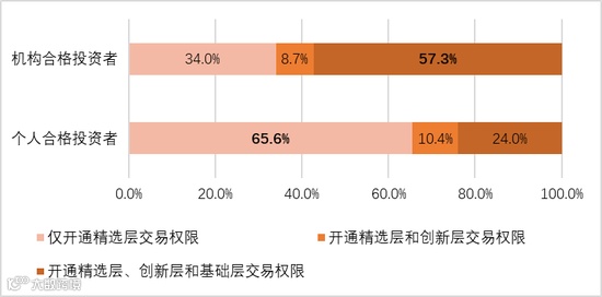 (一)受调查个人合格投资者仅开通精选层交易权限的居多,机构合格投资者开通精选层、创新层和基础层交易权限的居多