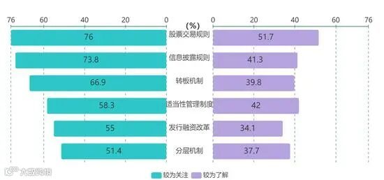 图 6:受调查投资者对新三板改革各个方面表示较为关注和较为了解的比例