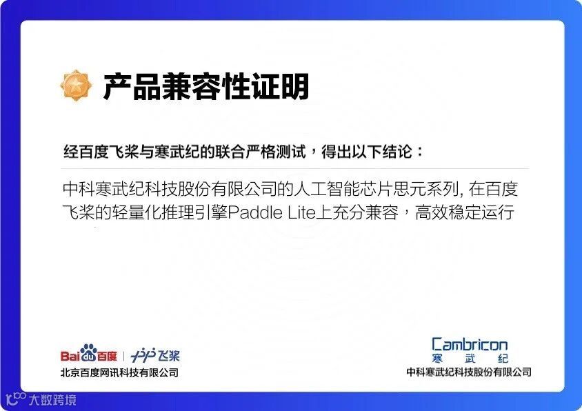 ▲百度飞桨与寒武纪兼容性认证书