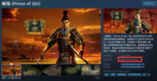 Steam平台显示:《秦殇》将于12月29日(明天)进行重新上架,主旨是为了曾经深爱这款游戏的玩家在时隔20年后,能重新追忆当年的风采,特此针对现在的系统运行环境及显示器尺寸优化了分辨率,支持窗口化及1080P分辨率。