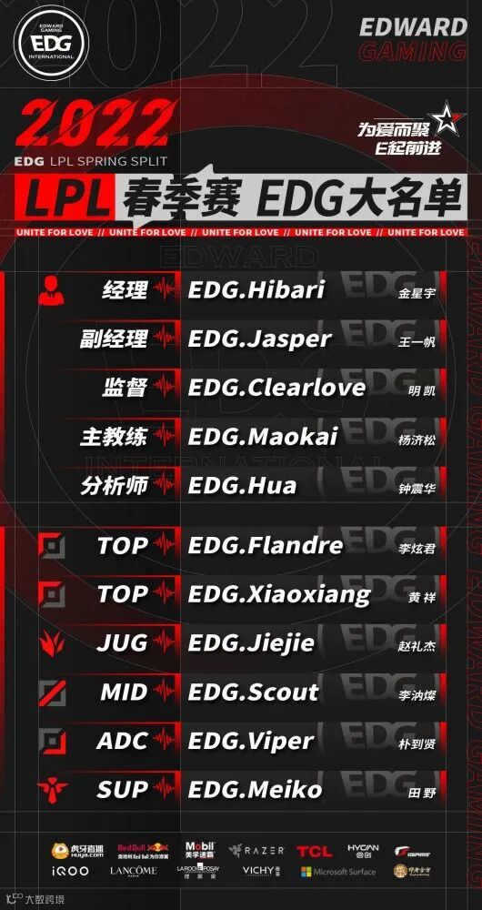 S11英雄联盟全球总决赛上的夺冠,意味着EDG只需要维持住原有阵容就依旧具备争冠实力。虽然在休赛期放走了junjia、Hope以及主教练朱开,但在外界普遍评价中,他们还是S+战队。今天中午,EDG的官方微博就正式公布了春季赛大名单。