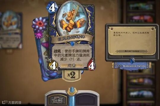最后要说的就是花岗岩熔铸体了。在之前的版本更新当中,花岗岩熔铸体已经被削弱了生命值。但是它的核心作用,其实还是在于对于整个元素萨卡组的降费作用。雪落守护者被削弱之后依旧能够维持在构筑当中,很大程度上都要归功于花岗岩熔铸体。如今的标准环境当中,只要5费能够顺利打出雪落守护者,对于那些铺场卡组来说,依旧是非常头疼的。因此元素萨抢场面的关键,就是能否准时磨刀花岗岩熔铸体和雪落守护者。